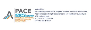 Method Pro is an approved AGD PACE Provider of dental continuing education. Method Pro strives to deliver balanced, objective and clinically relevant information grounded on scientific research. Lecturers who are invited to deliver Method Pro CE Presentations are advised to substantiate their claims with research-supported data and to disclose all commitments to, or relationships with, any commercial entity within the dental industry. In many cases, lecturers are sponsored by a dental manufacturing company, which provides them with support in the form of honorarium and/or dental products and equipment in order to help with clinical presentations. Prior to each live or recorded CE webinar or event, lecturers are made aware of the importance of delivering their presentations without commercial bias, and where appropriate, to mention a variety of different product choices that may be relevant to the subject matter of the lecture, for the educational benefit of the participant.